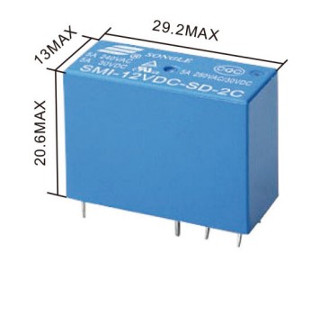The SONGLE SMI-12VDC-SL-2C is a compact, sealed two-pole changeover (2-C) power relay in an 8-pin PCB package. Designed for PCB solder mounting, it packages two SPDT contact sets in one small footprint so designers can switch two independent circuits or provide double-pole switching for higher safety and isolation. The relay is intended for general power-control use where a small form factor, reliable contact switching and moderate load capacity are required.